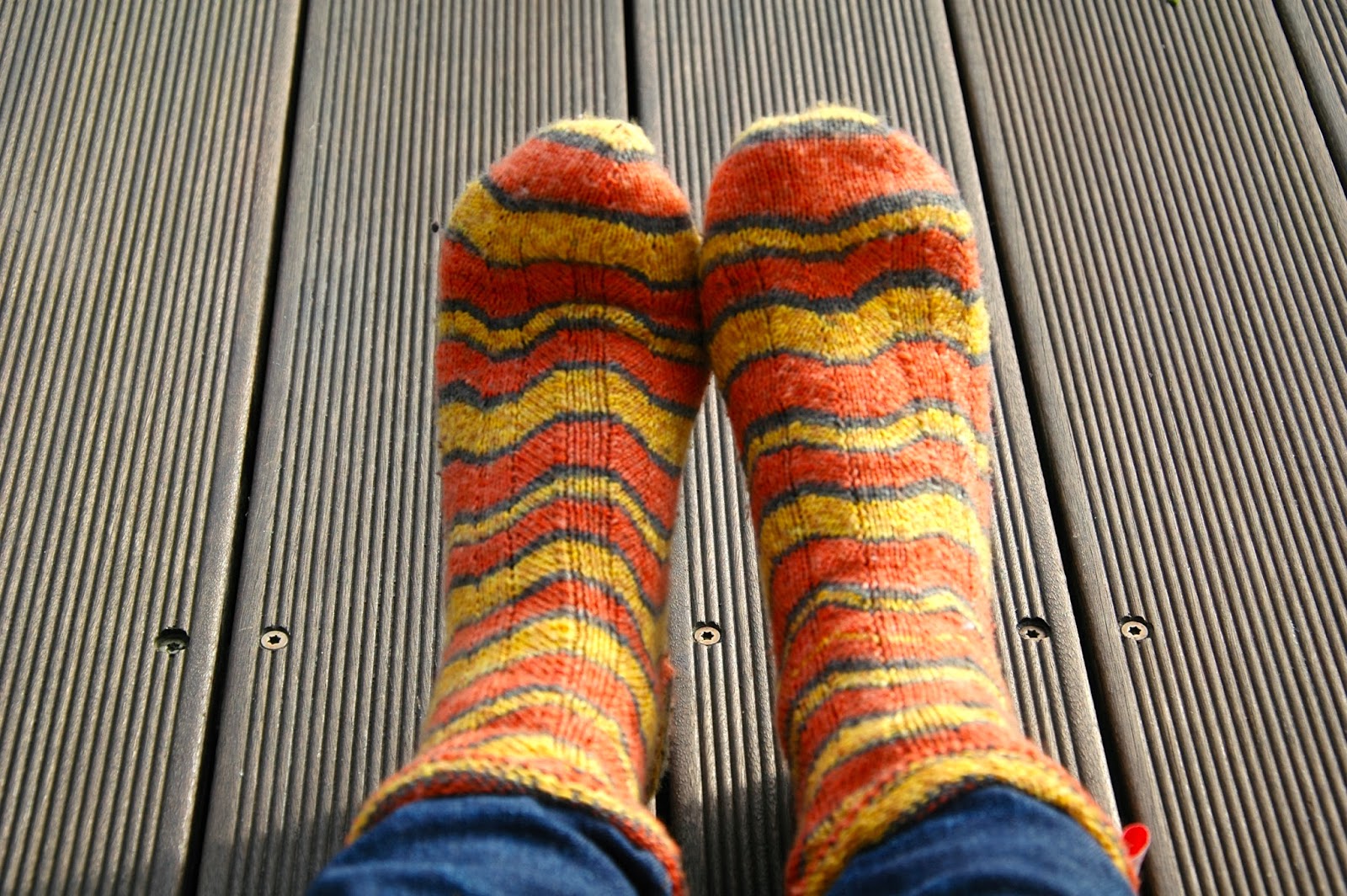Die Socken sehen wirklich genial aus, besonders, weil Du auch nicht auf den Rapport geachtet hast. Bei manchen Färbungen macht das den ganz besonderen Reiz aus, ich mag das sehr, wenn sie unterschiedlich sind, aber man doch sieht, dass die Socken zusammen gehören.